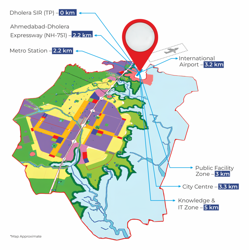 Located at 0 km from Dholera SIR, with direct access to the expressway, airport, metro, and key city zones.